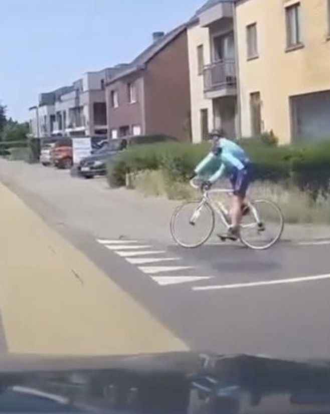 Deze wielrenner komt er zonder boete of ongeluk vanaf. Alleen met een viraal moment en publieke spot.