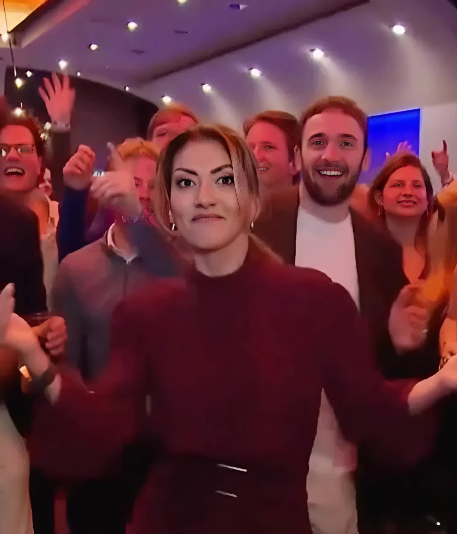 Op dat moment sloeg de sfeer om van gespannen naar opgelucht. Terwijl andere partijen nog worstelden met de uitslagen, zette iemand bij de VVD de muziek iets harder. En daar stond Dilan — lachend, losjes, met een glaasje in de hand — al dansend tussen haar teamleden.