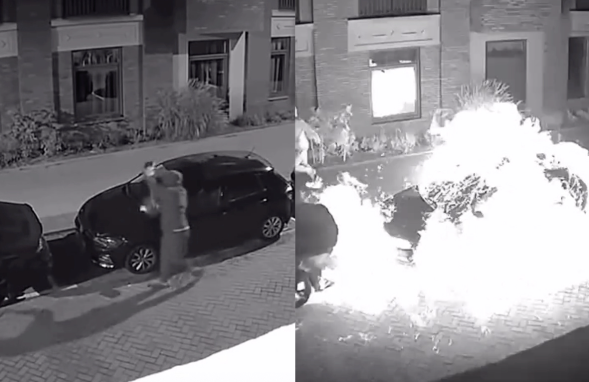 De video toont een auto die vlam vat en binnen korte tijd hevig brandt. Mensen op straat reageren geschrokken. Er is rookvorming en het vuur verspreidt zich snel door het voertuig. Opnames van voorbijgangers laten de stress en de verbijstering zien; telefoontjes naar hulpdiensten, mensen die terugdeinzen en automobilisten die hun route aanpassen.