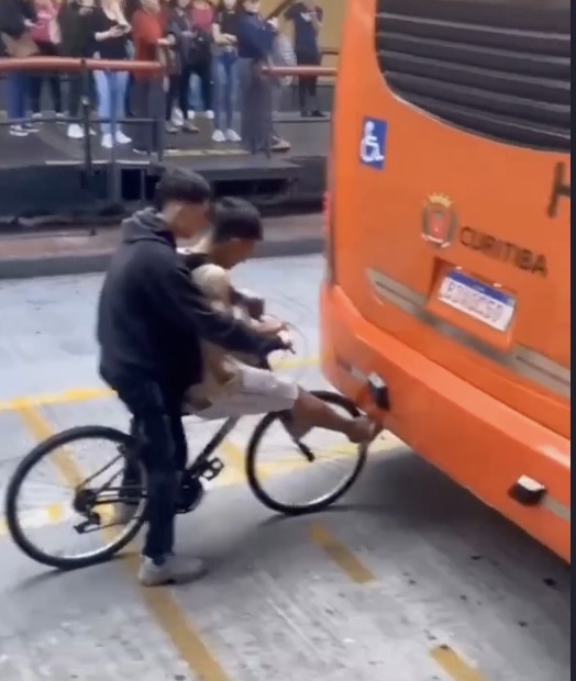 Het filmpje laat zien hoe de twee lifters, zonder enig schaamtegevoel, zich vastklampen aan de achterkant van de rijdende bus. Een soort extreme versie van carpoolen, maar dan met nul hersencellen. De bestuurder had het eerst niet door, tot hij in z’n spiegel iets zag bewegen.