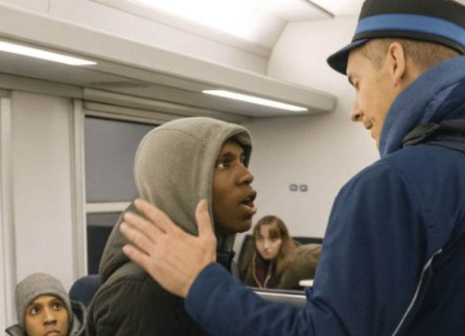 Het publiek in de trein voelde direct de spanning. Mensen die net nog relaxed uit het raam zaten te staren of met hun koptelefoon muziek luisterden, haalden die oortjes er nu snel uit. De rust was weg. Sommige passagiers probeerden de boel te negeren door overdreven op hun scherm te kijken, maar iedereen hoorde en voelde de woordenwisseling.