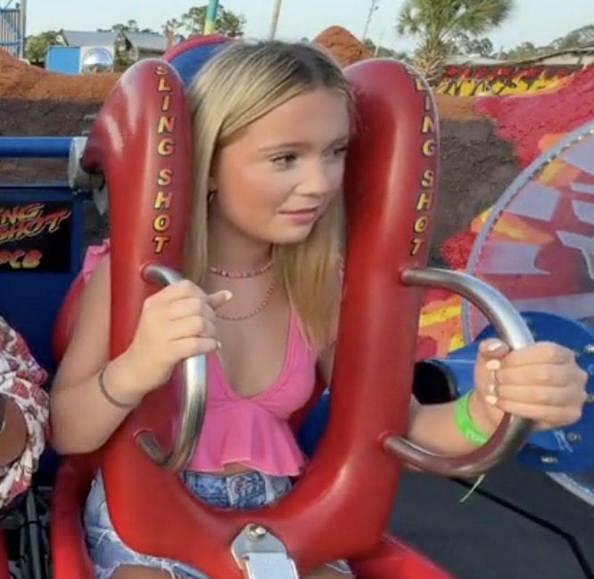 Het beeld is bijna filmisch. Haar haar waait alle kanten op, ze klemt haar armen naar voren, alsof dat iets zou helpen. En ondertussen zwiept de attractie haar heen en weer alsof ze een washandje is in de centrifuge.