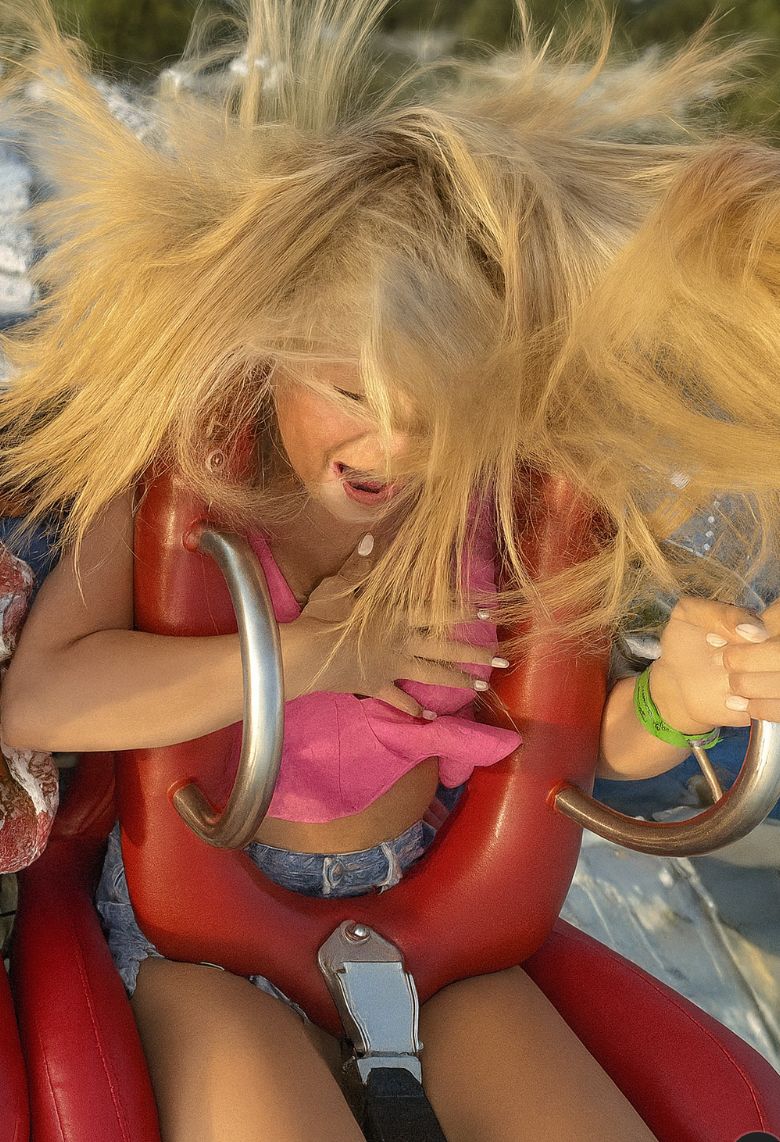 Het beeld is bijna filmisch. Haar haar waait alle kanten op, ze klemt haar armen naar voren, alsof dat iets zou helpen. En ondertussen zwiept de attractie haar heen en weer alsof ze een washandje is in de centrifuge.