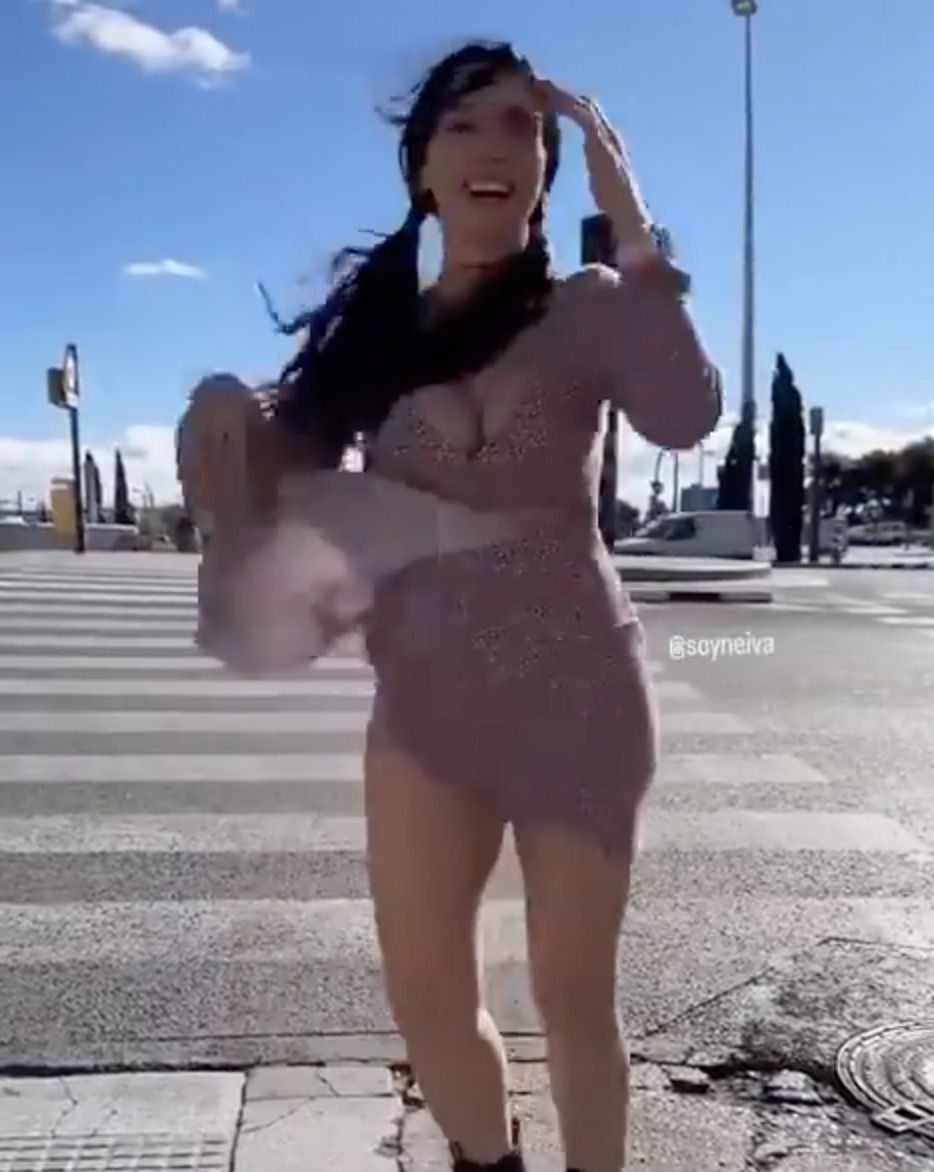 De jonge vrouw straalt het perfecte zomerplaatje uit: gebruinde huid, zonnebril op, haren los en een jurkje dat nét wat te luchtig blijkt voor de omstandigheden. Ze poseert even voor de camera, waarschijnlijk voor een vakantievlog of een story, en dan gebeurt het onvermijdelijke — een plotselinge windvlaag blaast alles de verkeerde kant op.
