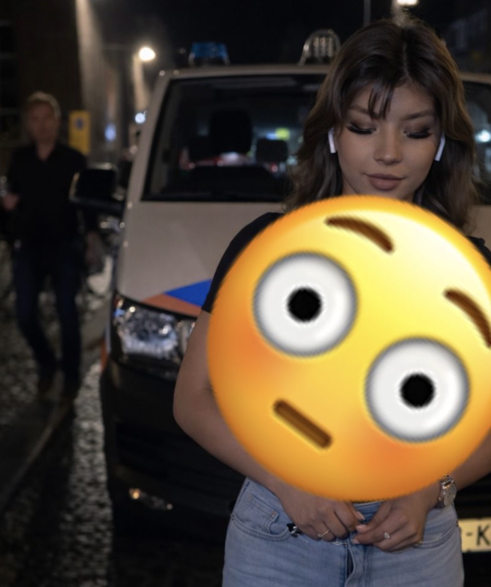 Wat meteen opvalt, is dat de dame zich weinig aantrekt van de aanwezigheid van de politie. Integendeel, ze lijkt het moment juist te gebruiken om op te vallen.