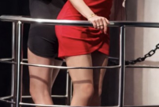 Vanuit beneden kwam er plots een frisse luchtstroom richting de dansende dames, volledig onverwacht en duidelijk bedoeld als speels moment.