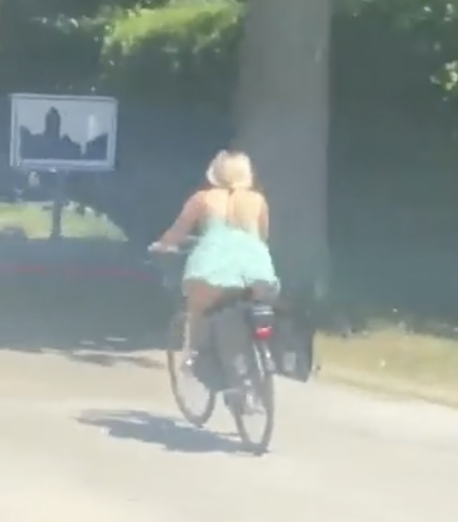 Voor de kijker achter de schermen zorgt dat voor extra humor. Want je weet dat zij denkt “gewoon lekker fietsen”, terwijl het internet inmiddels in een deuk ligt om het shot.