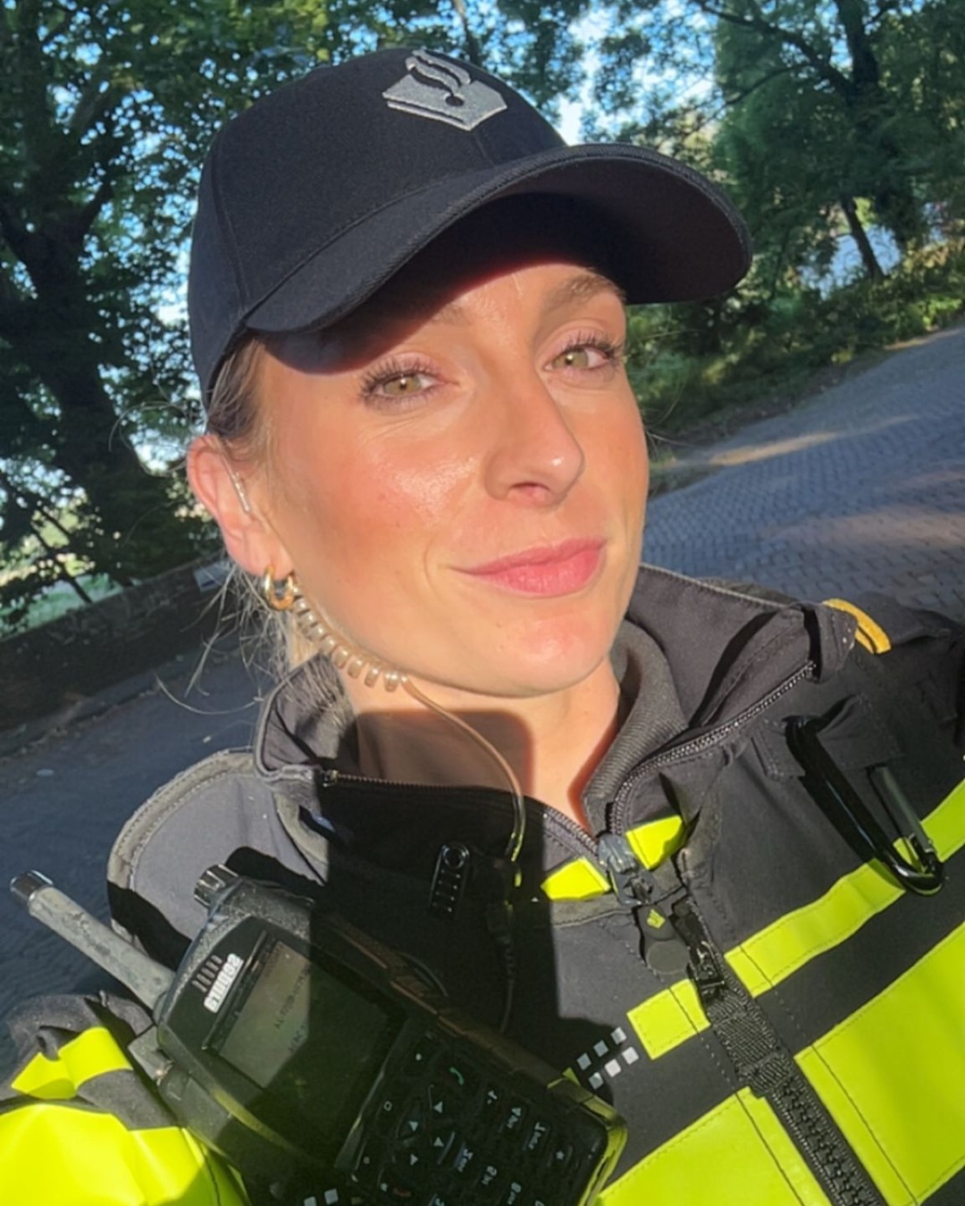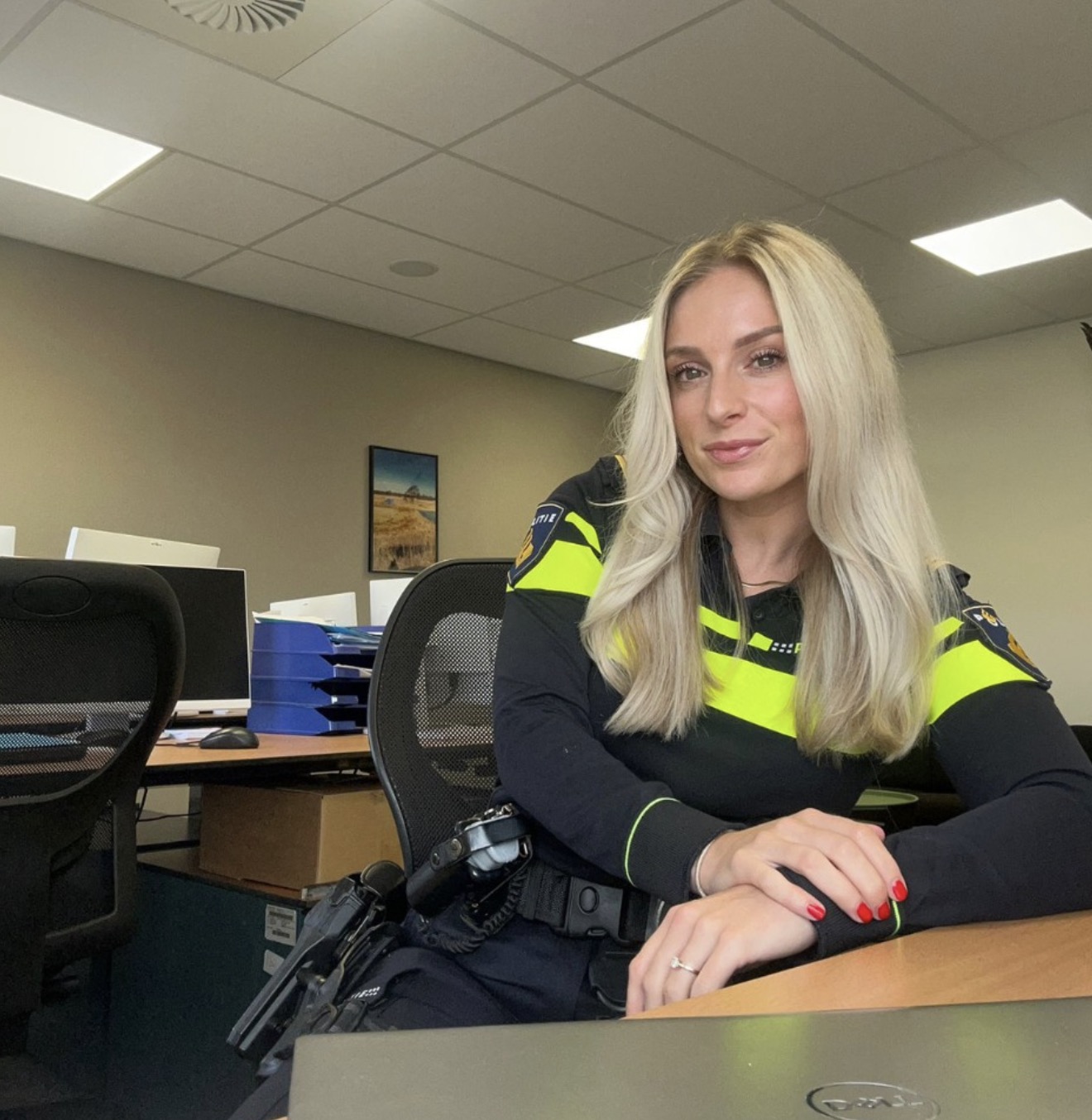 Op het eerste gezicht lijkt het niks bijzonders. Een agente zit op kantoor, achter haar bureau, laptopje open, alles netjes. Geen actie, geen sirenes, geen arrestaties. Maar dan die blik. Die houding. Dat zelfvertrouwen. En ineens is het geen “gewone werkfoto” meer.
