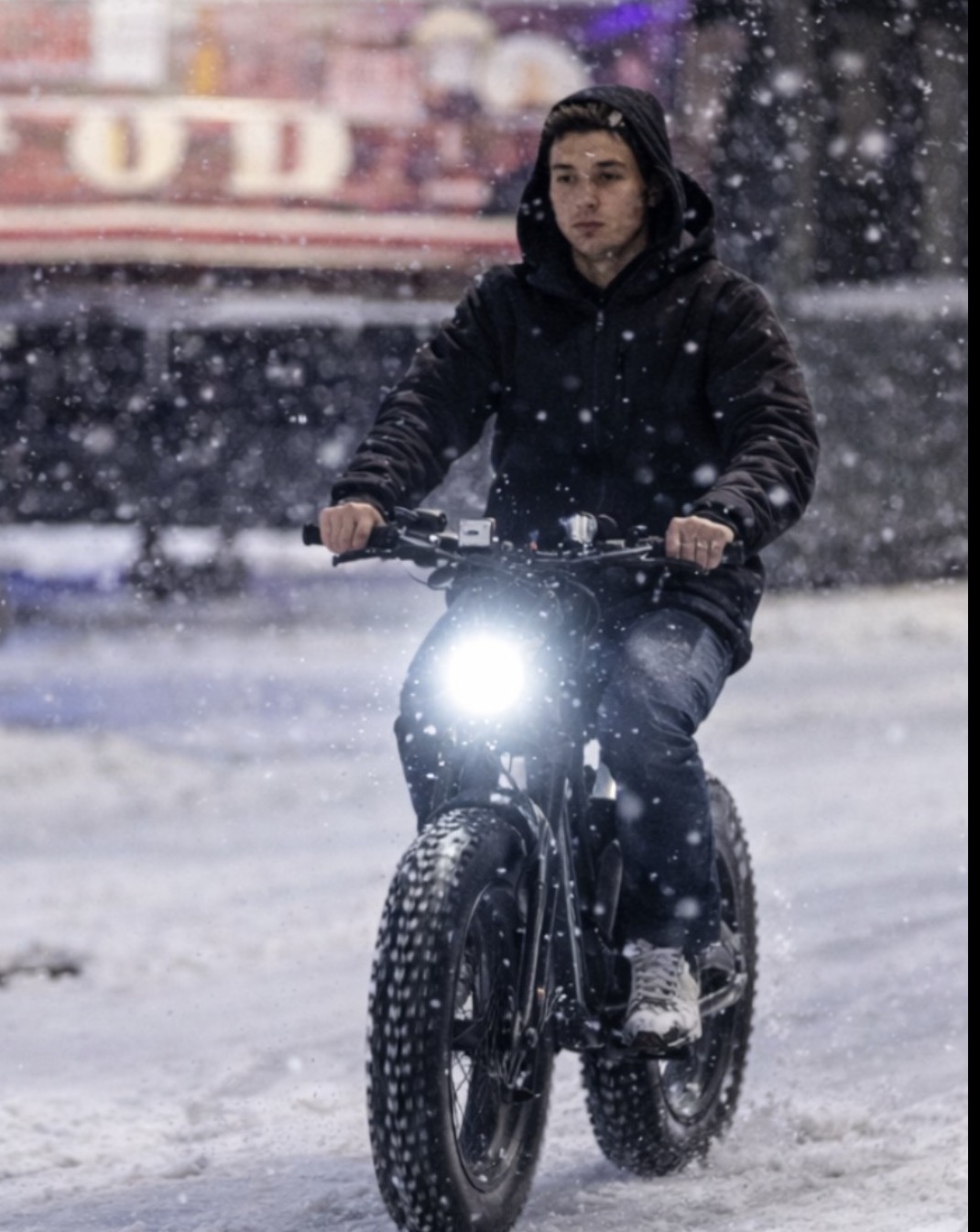 Met capuchon omhoog en het licht fel vooruit reed de jongen door de besneeuwde straat alsof hij onaantastbaar was. Omstanders keken toe, half onder de indruk, half met een voorgevoel dat dit mis zou gaan.