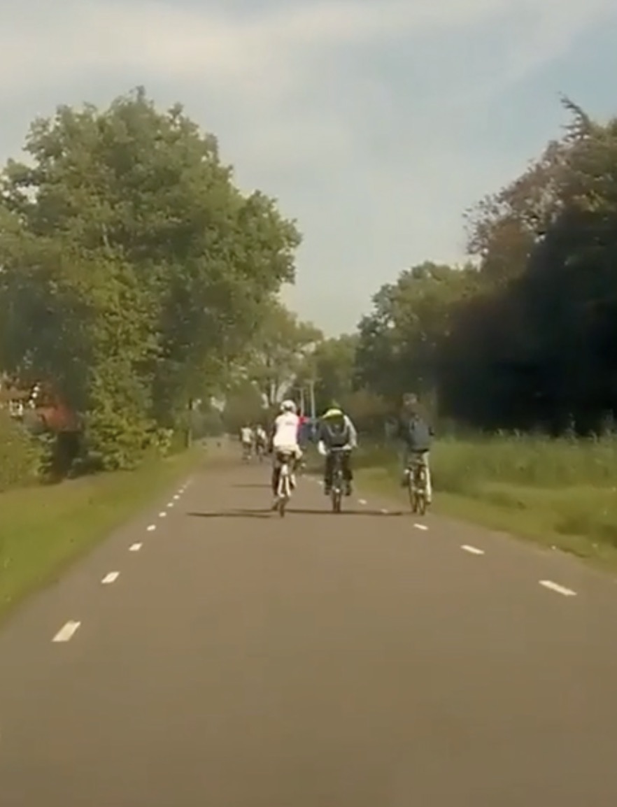 Wielrenners — je haat ze of je ontwijkt ze. Iedereen die ooit op een smalle landweg heeft gereden, weet precies wat ik bedoel: in groepjes van drie naast elkaar, armen in de lucht als je claxonneert, en altijd die blik van “ik bén het verkeer.” Maar wat er in deze video gebeurt, gaat nog een stap verder. Deze gast is niet zomaar irritant — dit is pure waanzin op twee wielen.
