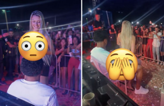 En dan komt het moment waar elke reaguurder op zit te wachten bij het bekijken van dit soort beelden. Ze pakt de zoom van haar jurkje vast met een blik vol ondeugendheid.