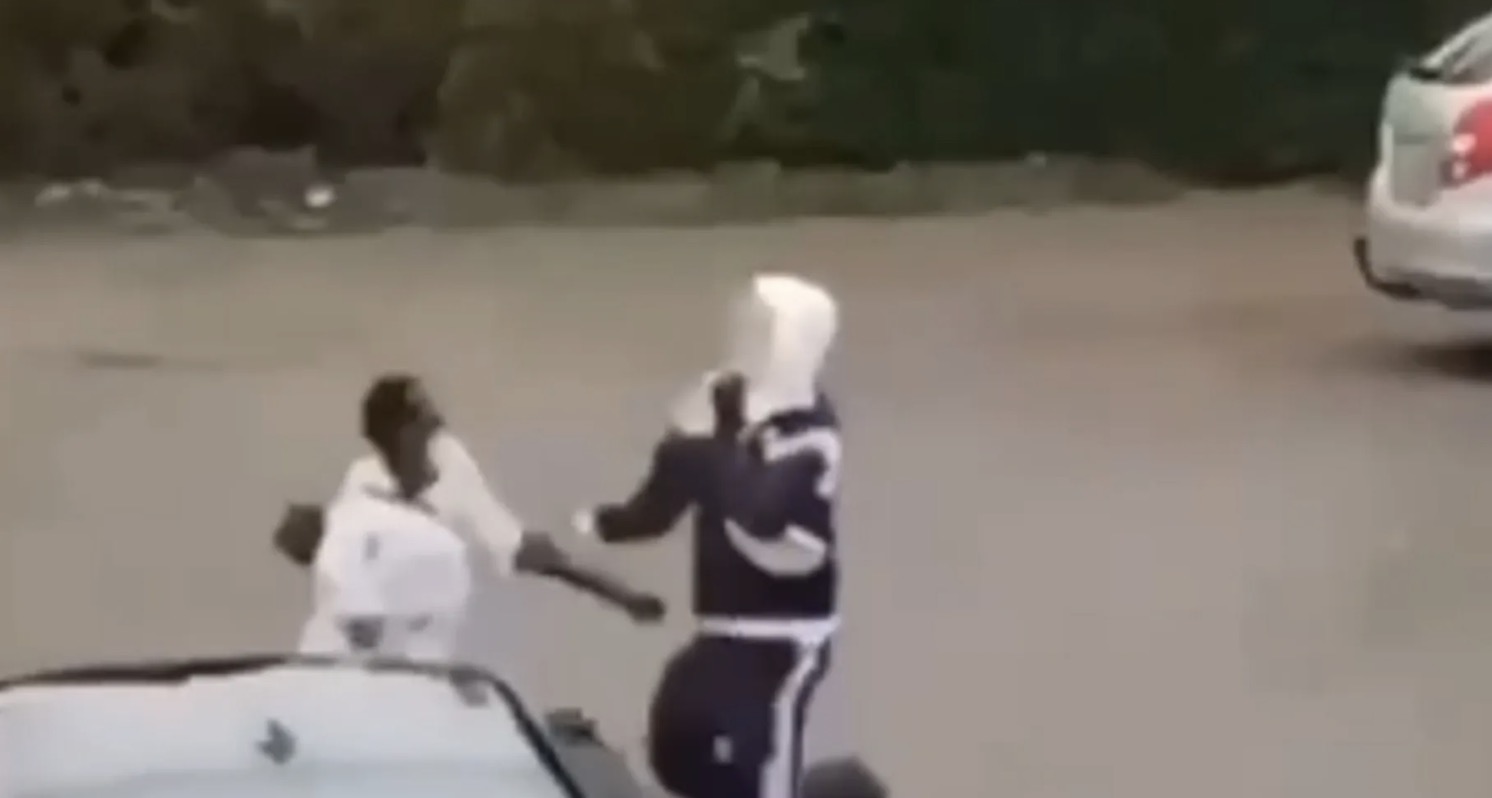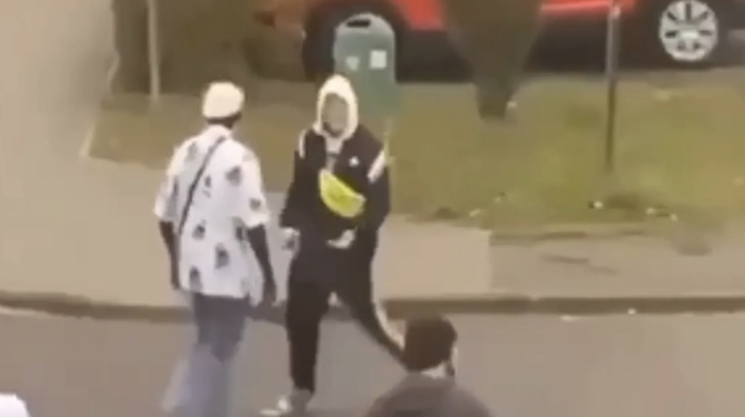 De video begint onschuldig. Twee jonge gasten, petje scheef, sigaret in de hand, staan tegen een muur te leunen. Een man in een wit shirt loopt voorbij, ogenschijnlijk onbewust van hun aanwezigheid. Totdat één van hen iets roept.