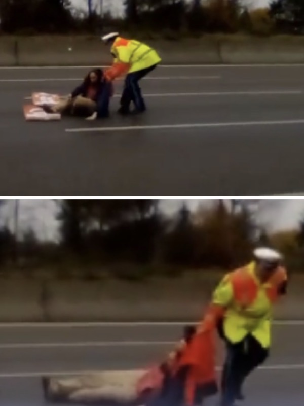 De activiste leek even van haar stuk gebracht, maar probeerde alsnog een nieuwe poging te wagen richting de snelweg. Wederom zette de agent haar kordaat terug, dit keer met nog meer nadruk op zijn bevel. Het beeld van deze interactie verspreidde zich razendsnel via sociale media.