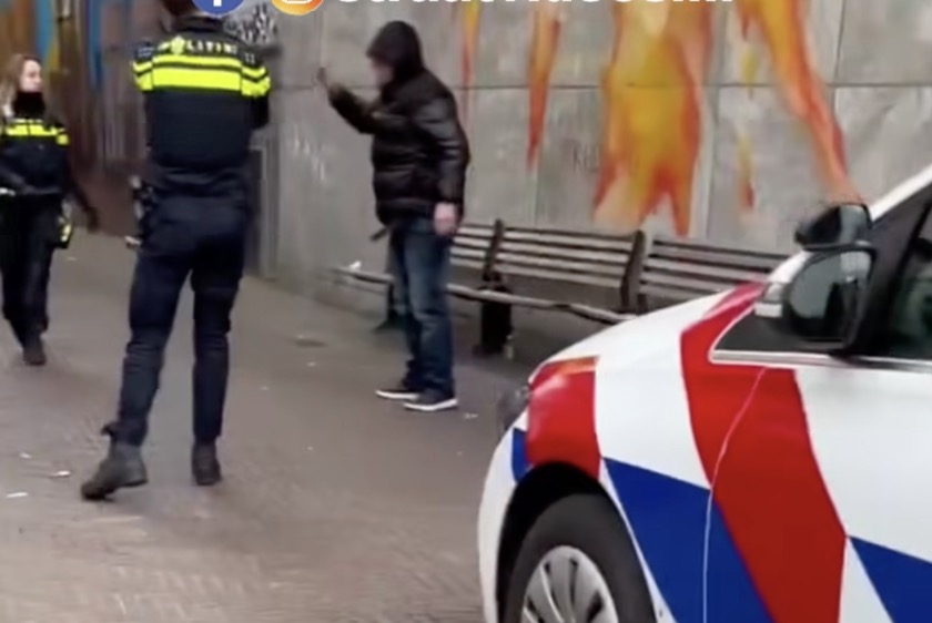 De video begint abrupt, zoals dat meestal gaat. Iemand filmt vanuit de overkant van de straat. Je hoort geschreeuw, commotie, sirenes in de verte. Twee agenten proberen een man met capuchon onder controle te krijgen, maar die vecht terug.