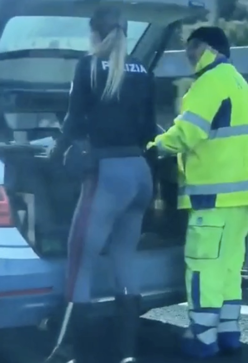 De video start rustig: zonovergoten straten, scooters die tussen de auto’s door slingeren, het typische Italiaanse verkeer met meer chaos dan logica. Alles lijkt normaal — tot de bestuurder plots zijn snelheid verlaagt. Aan de kant van de weg staat een politieauto met zwaailichten uit, en daarnaast een agente in uniform. Ze lijkt bezig met een routinecontrole, maar het is niet haar gezag dat de aandacht trekt. De camera zoomt iets in, en dan is het duidelijk: deze agente heeft een achterkant die bijna meer verkeer ophoudt dan een rood licht.