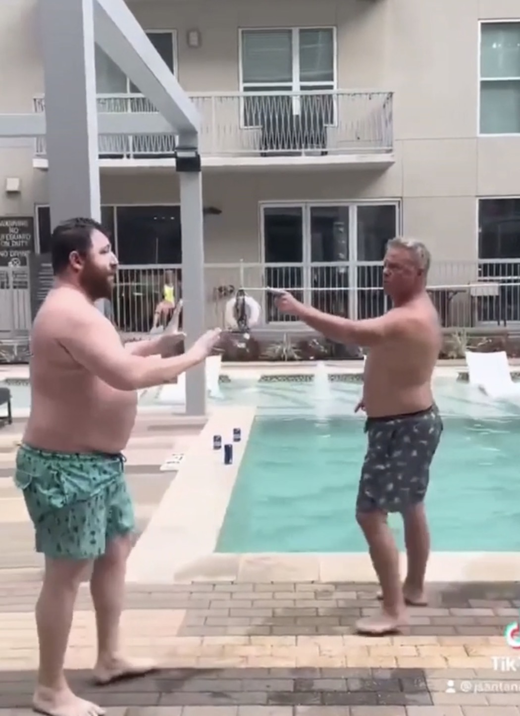 Wat het ook was, de situatie liep compleet uit de hand. De ene man droeg een wit T-shirt dat al snel meer weg had van een poetsdoek, de ander een zwembroek die de strijd niet overleefde. Toeristen grepen hun telefoons, beveiligers probeerden tussenbeide te komen, maar de twee bleven elkaar te lijf gaan alsof ze op een bokskaart stonden.