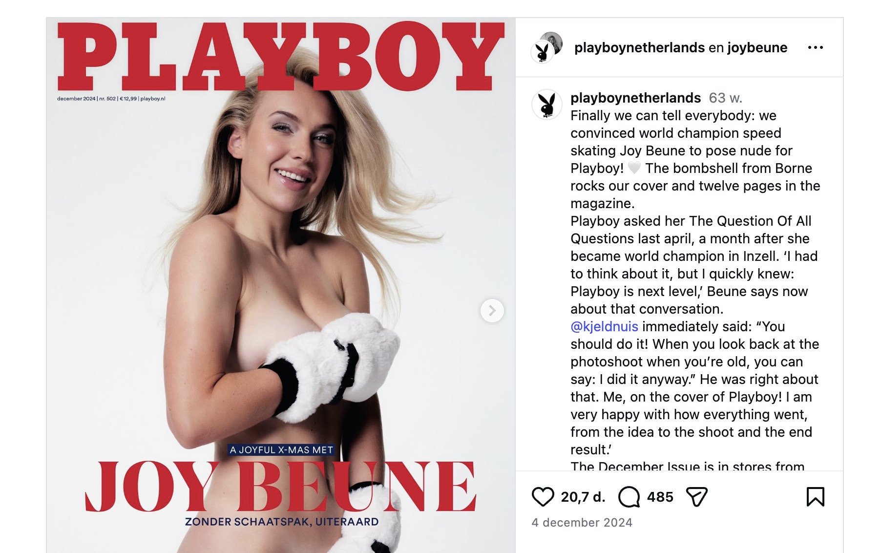 De 25-jarige topschaatsster besloot namelijk te poseren voor de kersteditie van Playboy. Geen kleine stap. Zeker niet in een sportwereld waar prestaties meestal belangrijker zijn dan glamour.